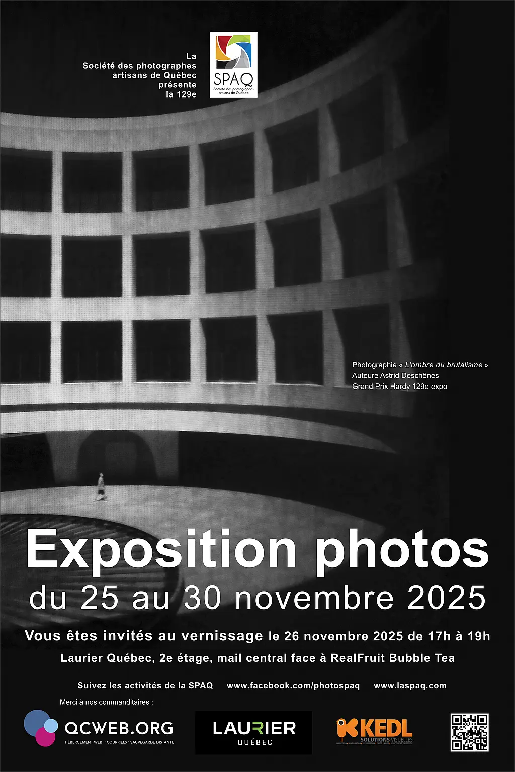 La SPPQ en collaboration avec le Musée de la photographie Desjardins (MPD) est heureuse de vous inviter au vernissage de la 21e édition de l’exposition Les Clubs photo s’exposent au MPD qui aura lieu dimanche 30 mars 2025 à compter de 13 h jusqu’à 17 h au Musée de la photographie Desjardins, situé au 400, rue Heriot, Drummondville (Québec) J2B 1B3.
